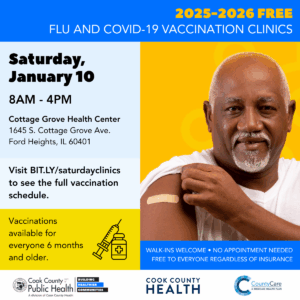 Cook County residents can get free flu and COVID-19 shots at Saturday vaccination clinics offered by Cook County Department of Public Health, Cook County Health and CountyCare, starting Saturday, Oct. 18 through March 28. The vaccination clinics will rotate on certain Saturdays of the month in five different Cook County Health ambulatory clinic sites located in Blue Island, Robbins, Ford Heights, Arlington Heights and North Riverside, Ill.