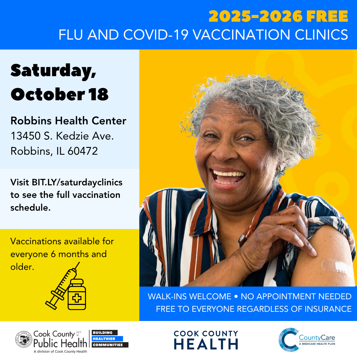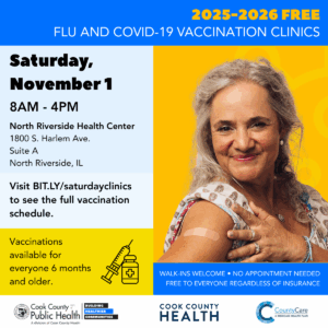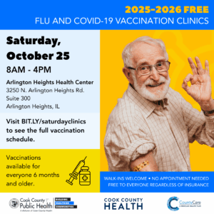 Cook County residents can get free flu and COVID-19 shots at Saturday vaccination clinics offered by Cook County Department of Public Health, Cook County Health and CountyCare, starting Saturday, Oct. 18 through March 28. The vaccination clinics will rotate on certain Saturdays of the month in five different Cook County Health ambulatory clinic sites located in Blue Island, Robbins, Ford Heights, Arlington Heights and North Riverside, Ill.