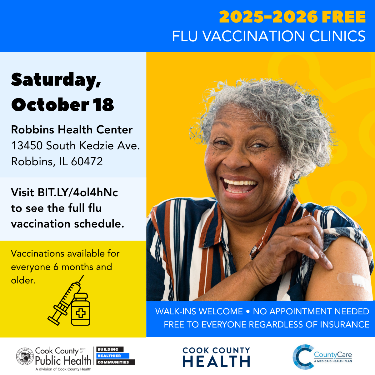 The vaccination clinics will rotate on certain Saturdays of the month in five different Cook County Health ambulatory clinic sites located in Blue Island, Robbins, Ford Heights, Arlington Heights and North Riverside, Ill. The very first vaccination clinic will occur at the Robbins Health Center, 13450 S. Kedzie Ave. in Robbins, Ill. on Oct. 18 from 8 a.m. to 4 p.m. Appointments are not required, and the shots are free of charge.