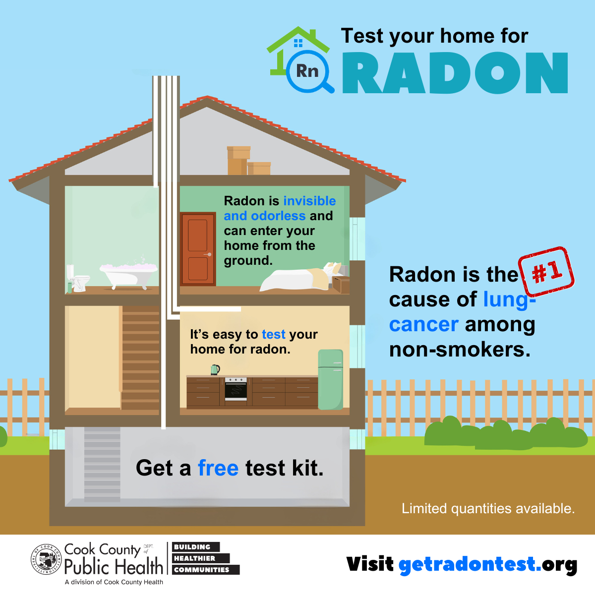 Request your free radon test kit today: Radon Test Kit Request – Cook County Department of Public Health