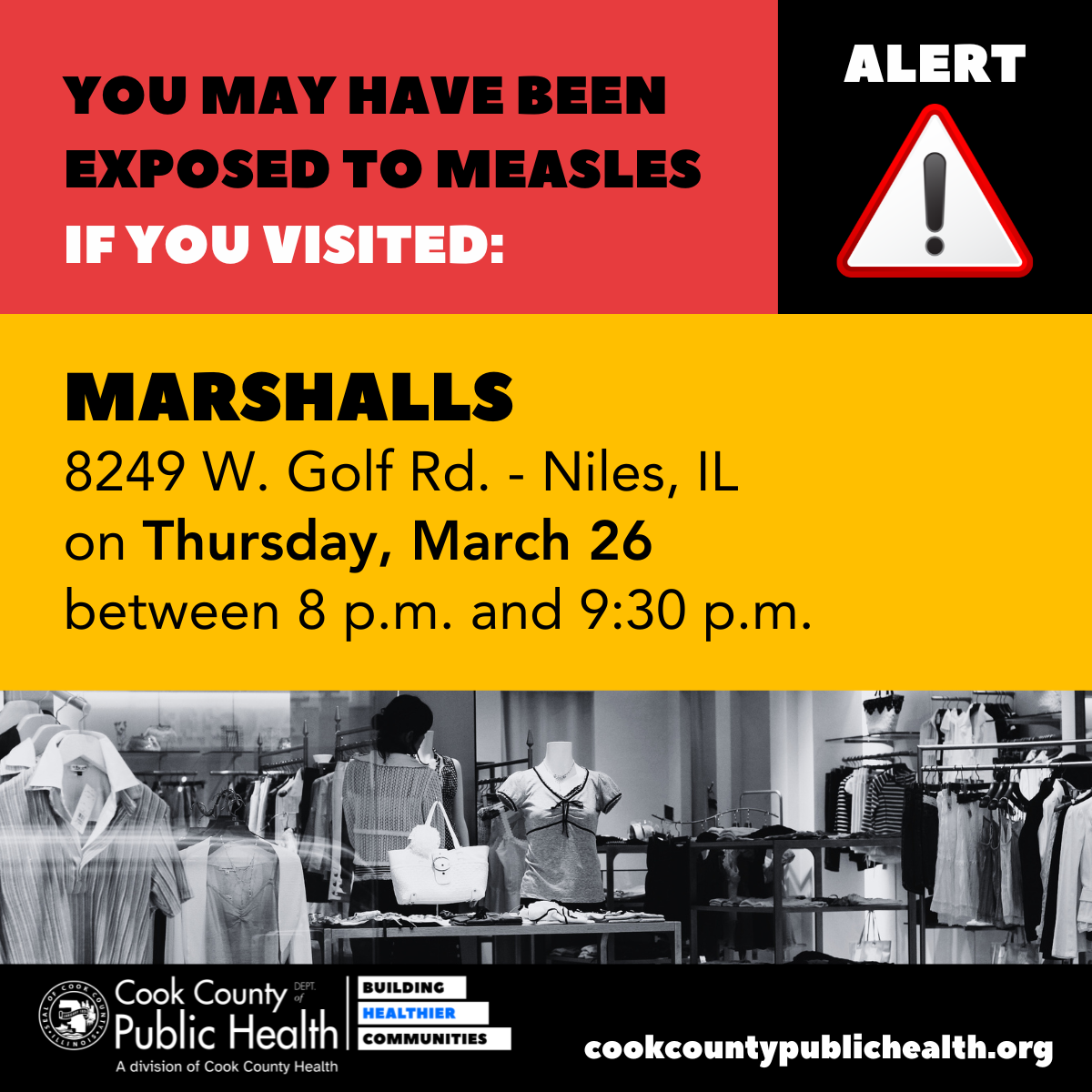 BRIDGEVIEW, IL – Cook County Department of Public Health (CCDPH) issued a notification this morning of possible measles exposures associated with an individual who visited the following locations while contagious.